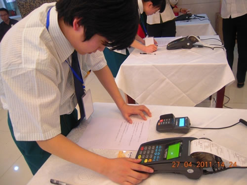 参赛选手熟练、准确无误的操作POS系统,做到刷卡流程准确、速度稳定