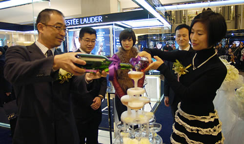 双方领导共同为庆祝雅诗兰黛盛装入驻兰州国芳百货倒入香槟