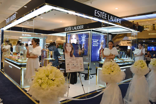 剪彩现场,礼仪小姐为顾客展示雅诗兰黛明星产品