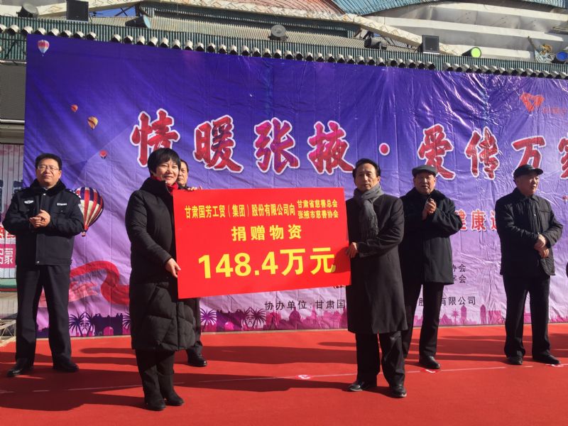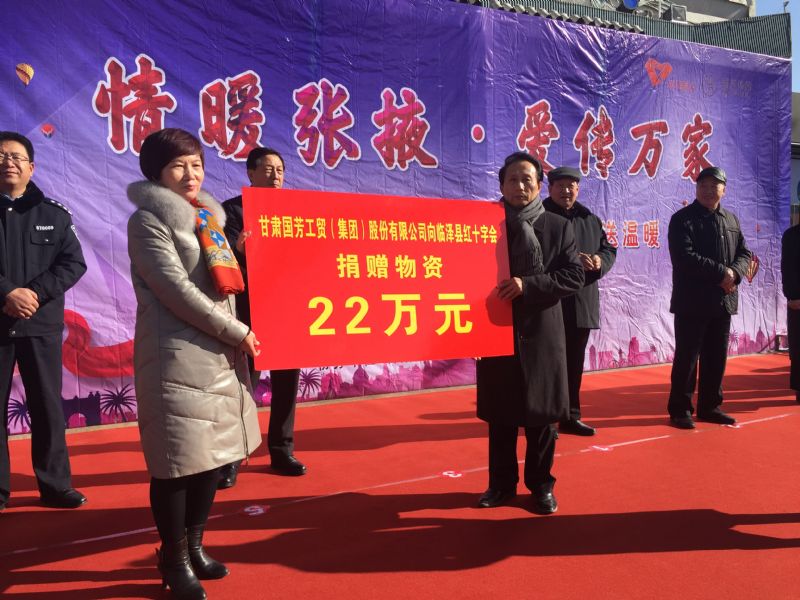 2019年1月11日,甘肃省慈善总会、张掖市慈善协会、甘州区慈善协会以及临泽县红十字会携甘肃国芳工贸(集团)股份有限公司在张掖市中心广场共同举行“情暖张掖·爱传万家”送健康送温暖活动,将2000套棉衣,2000余套秋衣秋裤,27台彩电以及300余件小家电合计价值148万元的过冬物资带给山丹县,民乐县的困难群众,将2500个医药箱带给临泽县的老人们。此次活动传导社会帮扶、精准扶贫精神的同时也默默为社会传导着一份正能量。