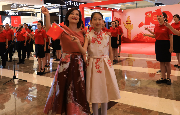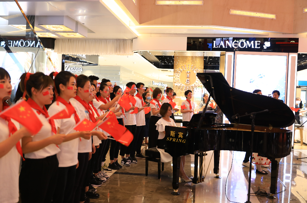 国芳百货中厅,随着钢琴声响起,活动在男、女领唱“歌唱我们亲爱的祖国,从此走上繁荣富强”的歌声中拉开了活动的序幕,30余名国芳集团党员及员工代表缓缓向主舞台走来,大家手持国旗,组合成“100”字样,神采奕奕,高声齐唱。与此同时,现场的围观顾客也纷纷加入到队伍当中,为演出锦上添花。