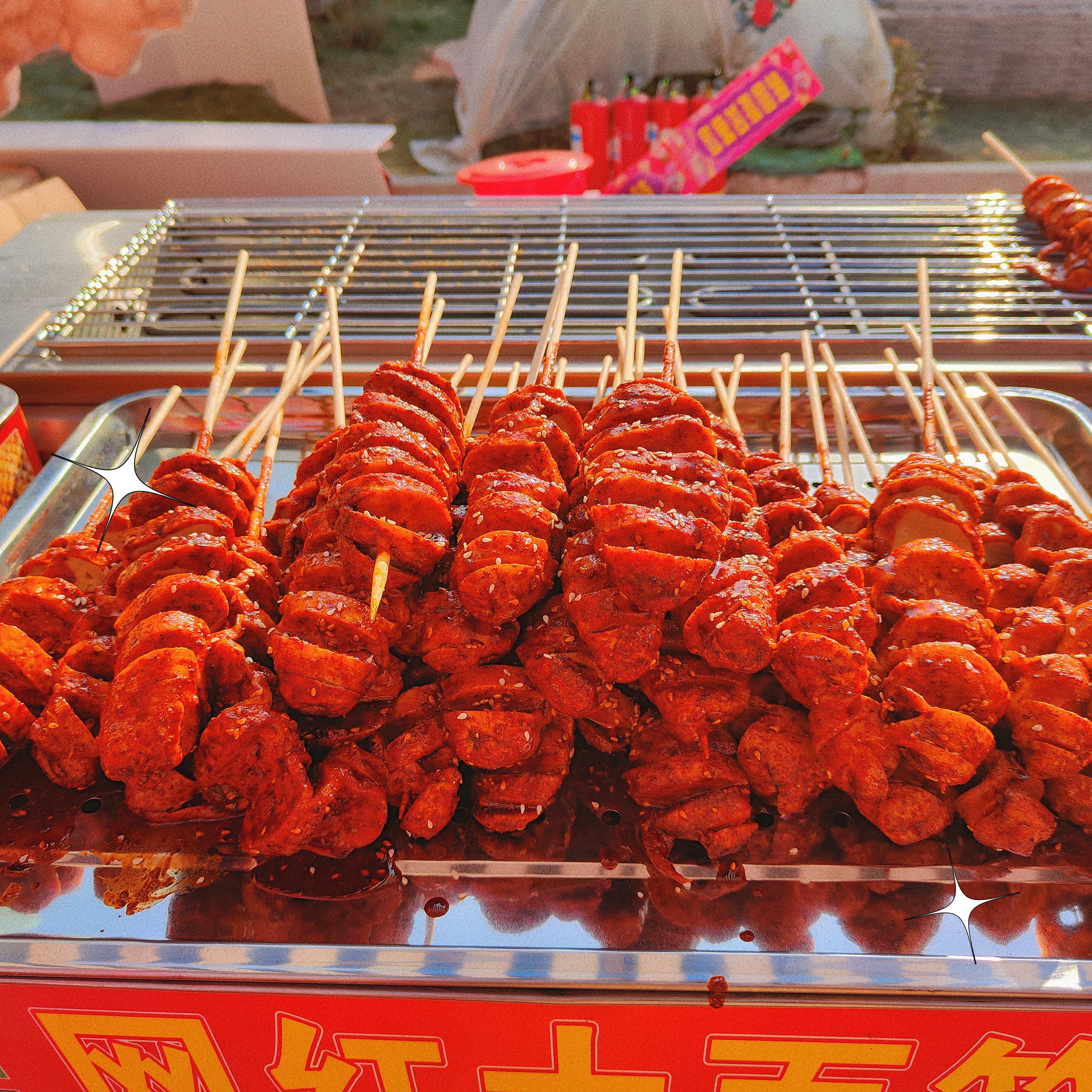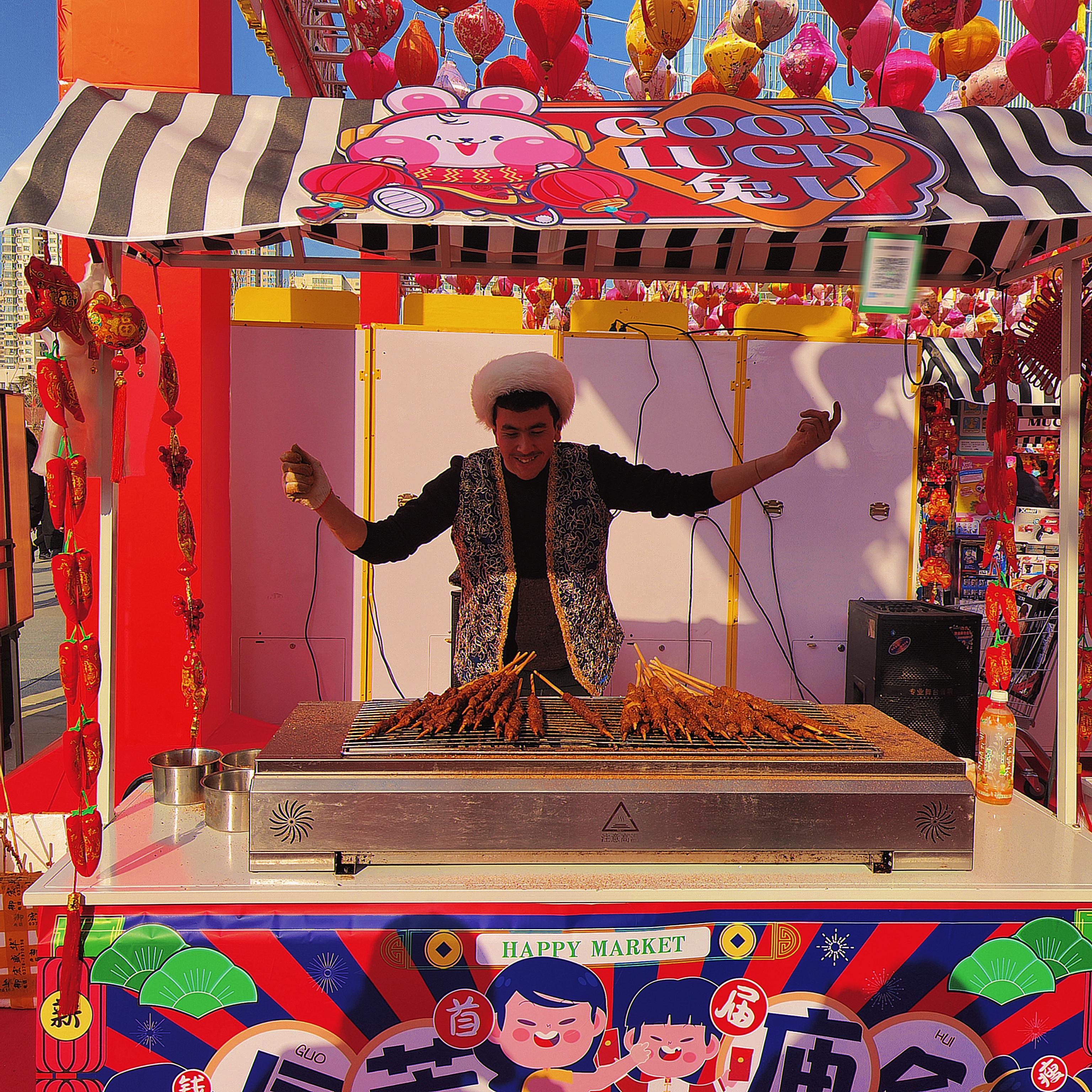 人间烟火处,年味渐浓时。新疆羊肉串、冰糖葫芦、臭豆腐、酸辣粉、网红大面筋,兰州热冬果……小吃摊生起腾腾热气,飘香十里。